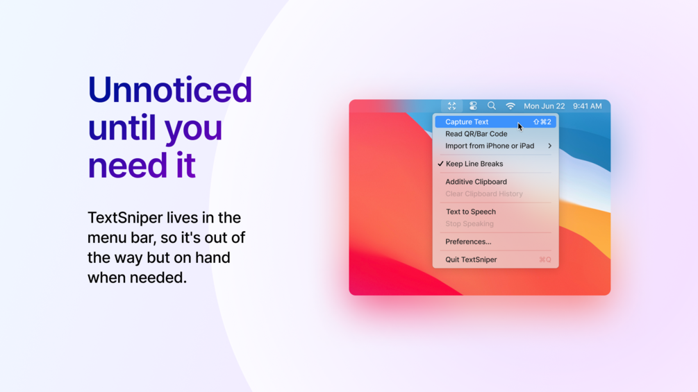 You can OCR any screen area in seconds with a single keyboard shortcut. Launch the TextSniper app. Press Shift+Command+2 (⇧⌘2) or click the TextSniper icon in the menu bar to select the Capture Text item. Next, draw the rectangle over the screen area you want to OCR. The text inside the selection will be instantly recognized and copied to the clipboard. Press Command+V (⌘V) to paste into any app: notes, pages, safari, social media, etc.
